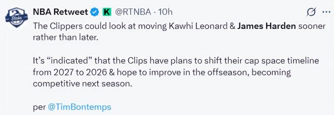 另一条消息来自NBA记者Tim Bontemps:快船可能会考虑交易伦纳德与哈登,而不是拖到之后,有迹象表明,快船计划将薪资空间的清理从2027年提前到2026年,并在明夏完成补强,以确保下赛季有竞争力。