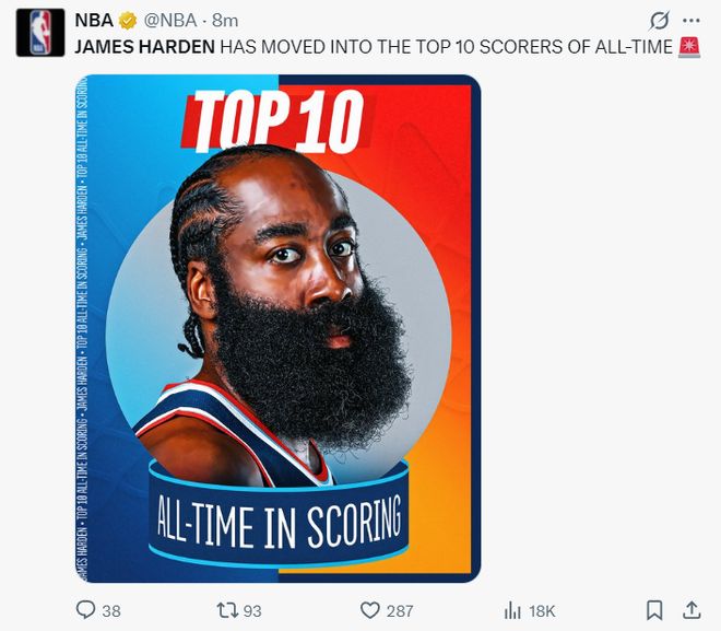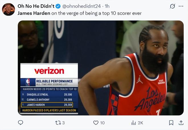 第三节哈登通过两个罚球超越安东尼正式进入NBA历史得分榜前十。NBA官方发推为哈登庆祝,第三节哈登5中1+三分2中0+罚球5中5,拿到7分2篮板2助攻1盖帽,三节打完已经拿到26分4助攻真的不算差。