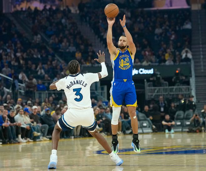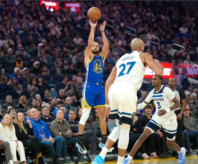 库里伤停五场比赛后复出,11月27日-12月13日也就是整整16天,但斯蒂芬的三分手感依旧令人咋舌,赛前他命中一个贯穿全场的超远三分球,这个球在天空中是一个弧线命中。